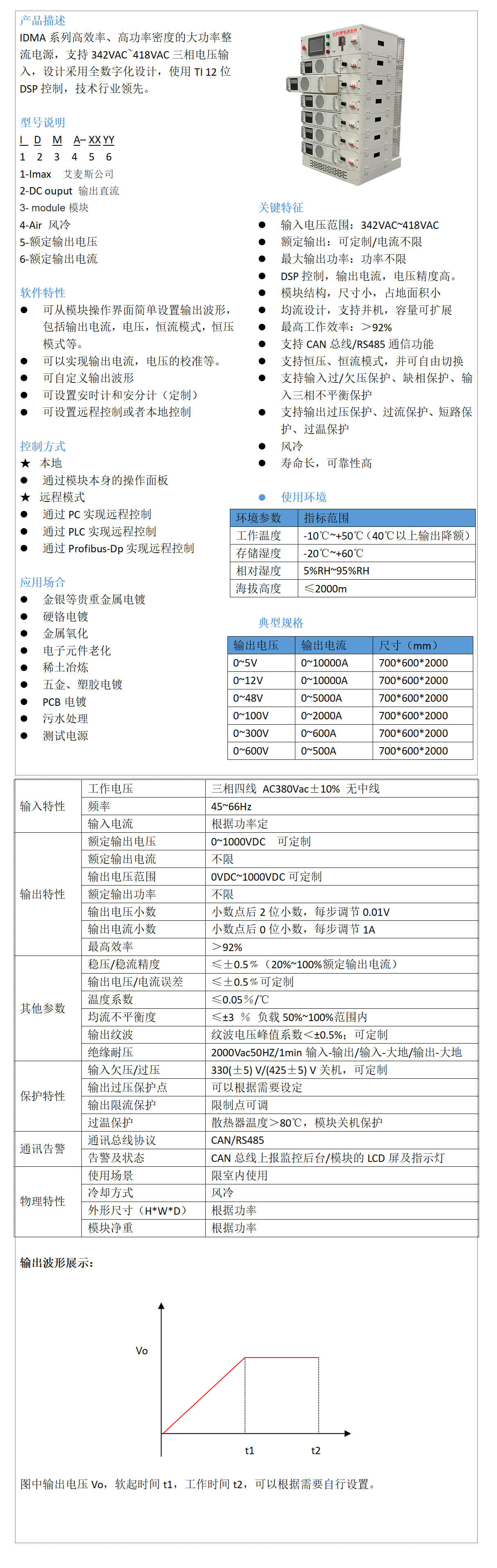 IDMA系列風(fēng)冷整流電源,系統(tǒng)采用N+X冗余設(shè)計(jì)電源模塊組成,容易擴(kuò)容,輸出并機(jī)均流,體積小巧,占地面積小。廣泛應(yīng)用在表面處理,電鍍電泳,陽極氧化,電熱處理,污水處理,單晶等行業(yè)。