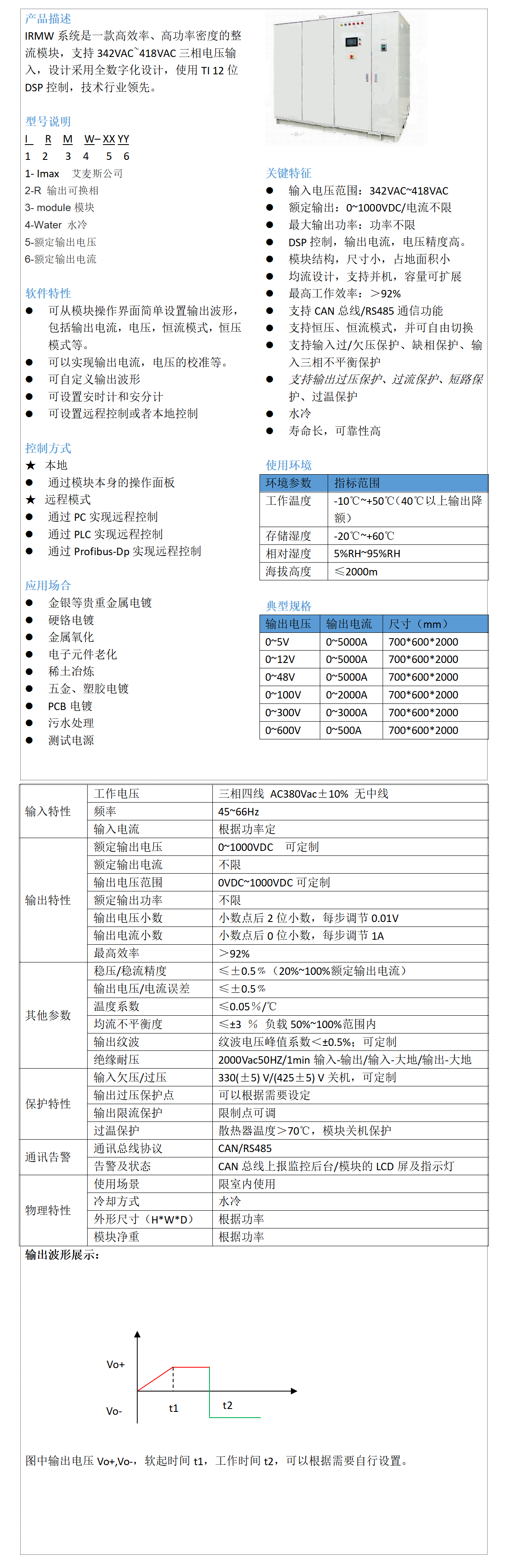 IRMW系列水冷整流電源,電子換向,行業(yè)最先進(jìn)的DSP數(shù)字控制,軟開關(guān)設(shè)計(jì),效率92%高效節(jié)能,水冷散熱,穩(wěn)定可靠。主要應(yīng)用于電解除油,褪鍍,周期換向鍍硬鉻