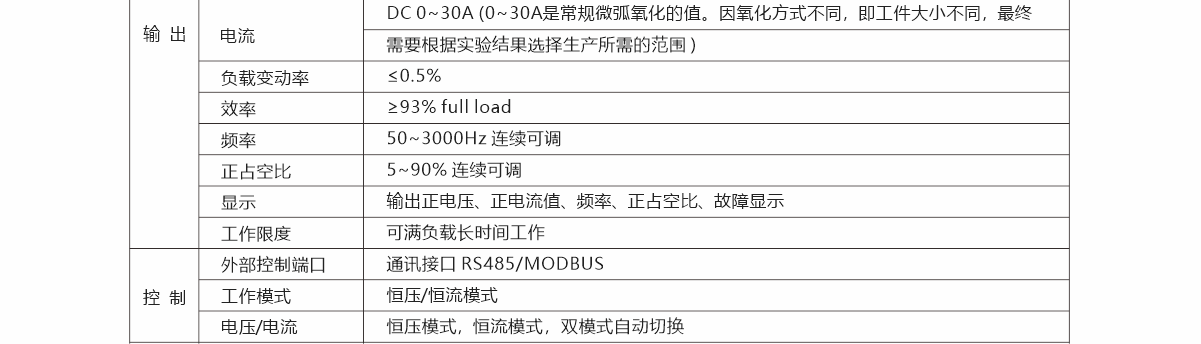 該電源為脈沖電源,為微弧氧化等需要脈沖的電壓和電流的情況而設(shè)計(jì)。電源采用高頻隔離設(shè)計(jì),采用先進(jìn)的DSP控制,輸出電壓穩(wěn)定,不因輸入電壓波動(dòng)而變化。輸出頻率和占空比可調(diào),波形良