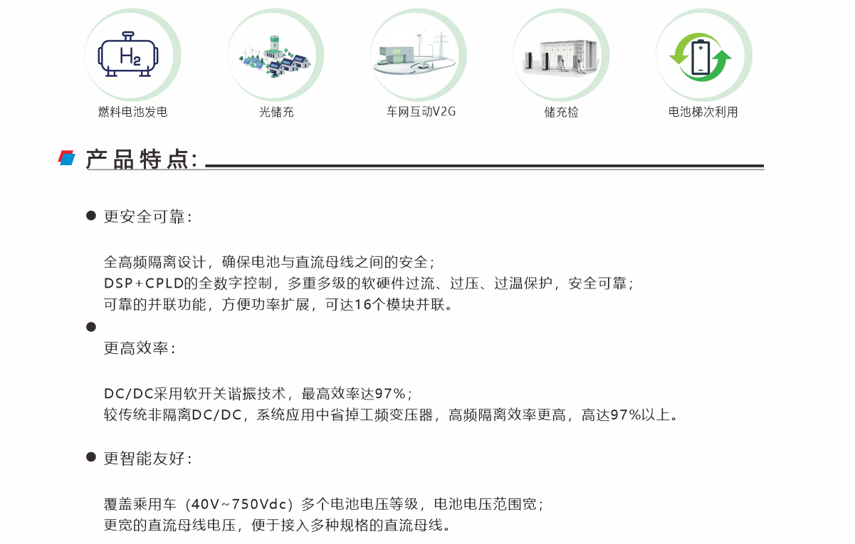 該雙向高頻隔離DC DC模塊采用高頻隔離雙向變換技術(shù),效率高,且變換器能量雙向流動,充放電自動轉(zhuǎn)換;采用DSP設(shè)計,支持模塊并聯(lián)功能,支持CAN RS485通信,方便與第三方設(shè)備進(jìn)行通訊。