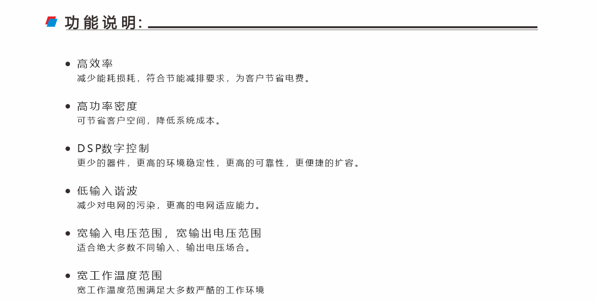 IM100-10K 系列高頻開關(guān)整流模塊為交流電壓輸入,直流電壓輸出可調(diào)的 ACDC 模塊。模塊采用 DSP 數(shù)字控制,諧振軟開關(guān),有源 PFC 技術(shù),并且具有多項專利保護(hù);