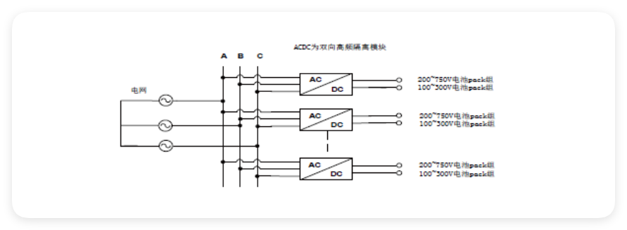 下圖(圖2)展示了雙向高頻隔離電源在電池化成與分容中的應(yīng)用解決方案。電池pack分組接入模塊,省去了工頻變壓器,使系統(tǒng)效率更高,尺寸更小。