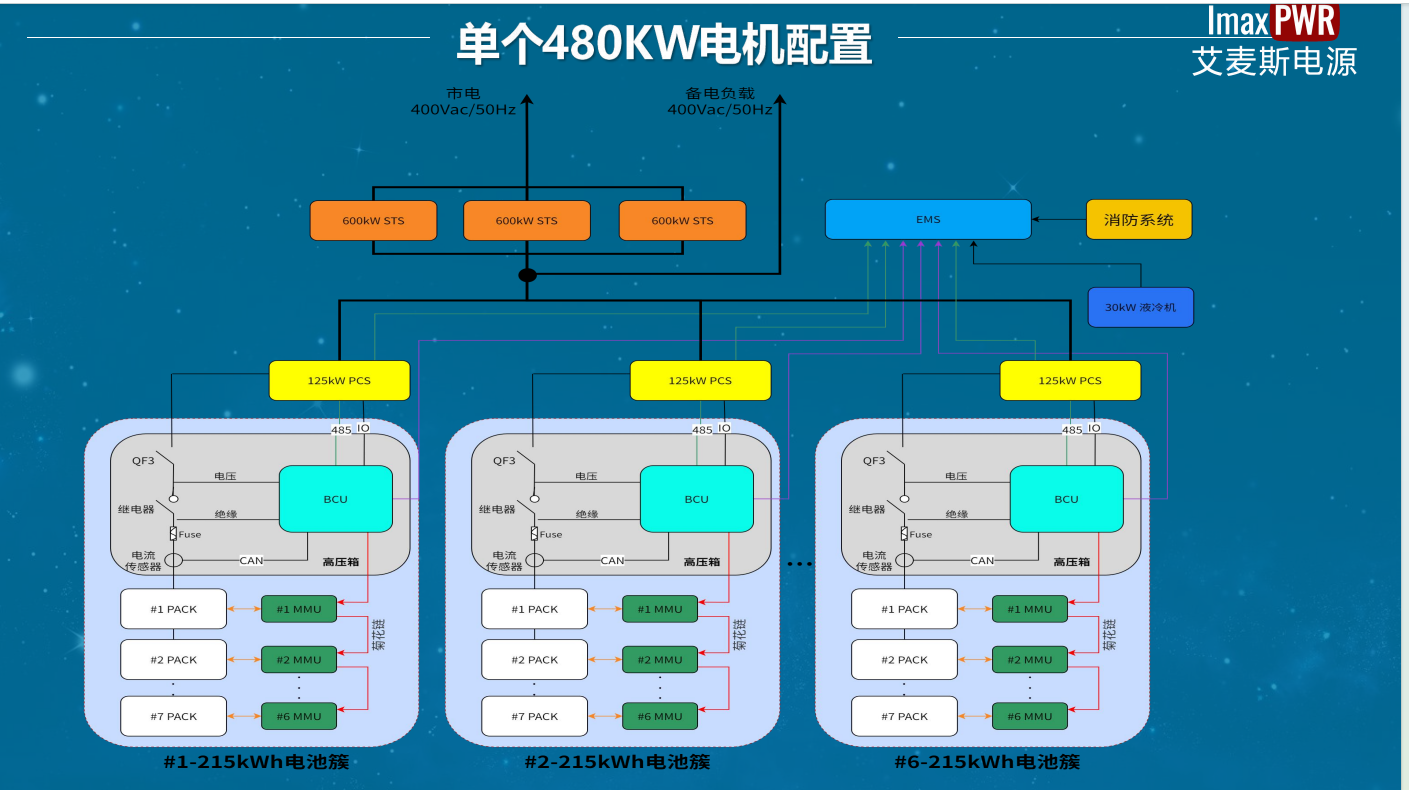 艾麥斯儲能針對行業(yè)痛點(diǎn),750KW 1300KWH并離網(wǎng)儲能系統(tǒng),采用6組215kWh電池簇。