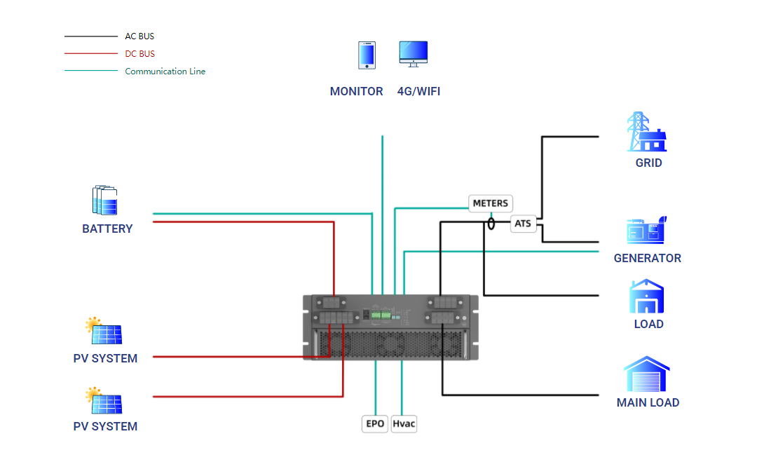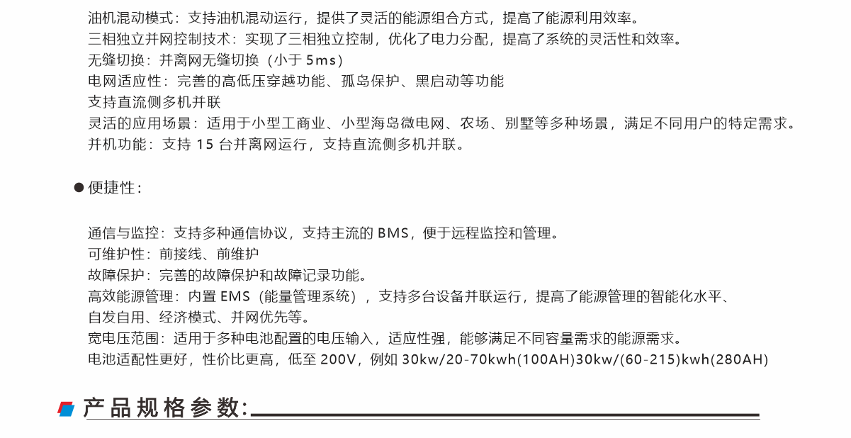 該產(chǎn)品主要針對中小型儲能微電網(wǎng)開發(fā)的一款高效、高可靠儲能逆變器,支持光伏接入,內(nèi)含EMS,并離網(wǎng)切換裝置,支持多臺并聯(lián)運行, 支持油機混動運行,支持并離網(wǎng)快速切換工作。