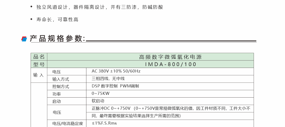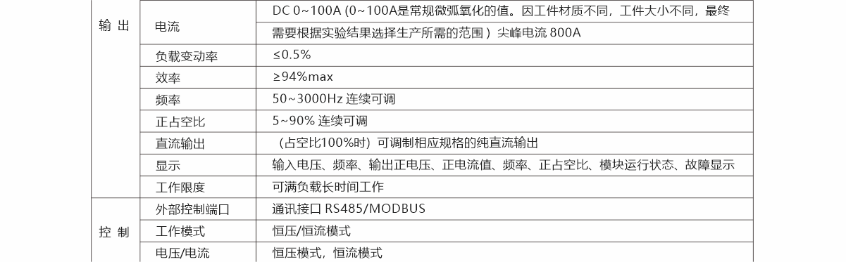 該電源為脈沖電源,為微弧氧化等需要脈沖的電壓和電流的情況而設(shè)計(jì)。電源采用高頻隔離設(shè)計(jì),采用先進(jìn)的DSP控制,輸出電壓穩(wěn)定,不因輸入電壓波動(dòng)而變化。輸出頻率和占空比可調(diào),波形良