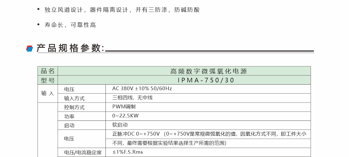 該電源為脈沖電源,為微弧氧化等需要脈沖的電壓和電流的情況而設(shè)計(jì)。電源采用高頻隔離設(shè)計(jì),采用先進(jìn)的DSP控制,輸出電壓穩(wěn)定,不因輸入電壓波動(dòng)而變化。輸出頻率和占空比可調(diào),波形良