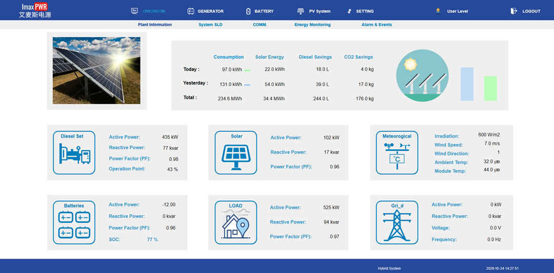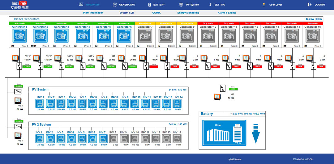 艾麥斯自主開(kāi)發(fā)的EMS適用于并網(wǎng)型和孤島型微電網(wǎng)系統(tǒng)。EMS主要包括微電網(wǎng)主控制器、柴發(fā)系統(tǒng)控制器、儲(chǔ)能系統(tǒng)控制器、風(fēng)力發(fā)電系統(tǒng)控制器、光伏發(fā)電系統(tǒng)控制器等。主控制器是微電網(wǎng)電站的核心控制設(shè)備,負(fù)責(zé)微電網(wǎng)內(nèi)的分布式電源出力與負(fù)載電量需求的動(dòng)態(tài)平衡控制,通過(guò)與柴發(fā)系統(tǒng)控制器、儲(chǔ)能系統(tǒng)控制器、風(fēng)力發(fā)電系統(tǒng)控制器、光伏發(fā)電系統(tǒng)控制器等與各系統(tǒng)進(jìn)行通訊,實(shí)現(xiàn)各發(fā)電系統(tǒng)、儲(chǔ)能系統(tǒng)、負(fù)載等系統(tǒng)數(shù)據(jù)采集和控制命令執(zhí)行,進(jìn)而保障微電網(wǎng)系統(tǒng)的安全穩(wěn)定經(jīng)濟(jì)運(yùn)行。