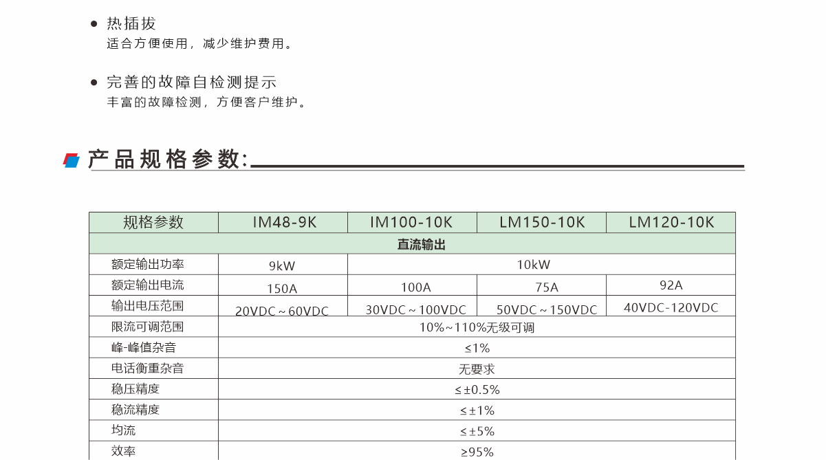 IM100-10K 系列高頻開關(guān)整流模塊為交流電壓輸入,直流電壓輸出可調(diào)的 ACDC 模塊。模塊采用 DSP 數(shù)字控制,諧振軟開關(guān),有源 PFC 技術(shù),并且具有多項專利保護(hù);
