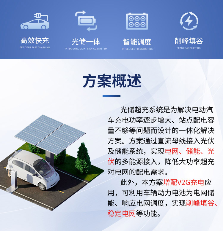 光儲超充解決方案是一種集光伏發(fā)電、儲能和超級充電于一體的綜合能源解決方案,旨在為新能源汽車提供高效、便捷、綠色的充電服務。該方案通過利用太陽能發(fā)電,將清潔能源轉化為電能,并通過儲能系統(tǒng)進行儲存和調節(jié),實現(xiàn)能源的高效利用和穩(wěn)定供應。同時,超級充電技術能夠大幅縮短充電時間,為用戶帶來更加便捷的充電體驗。